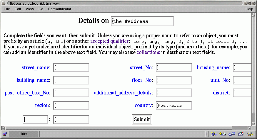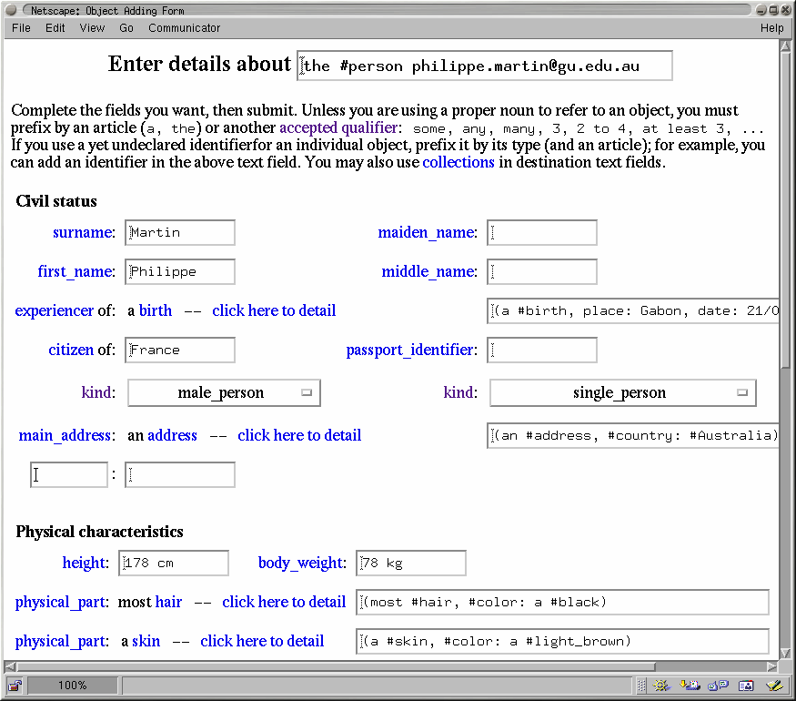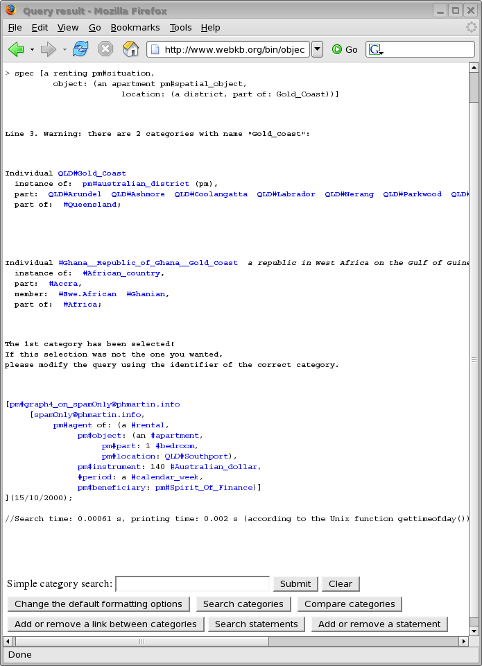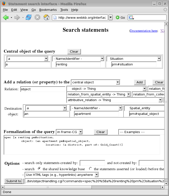 Knowledge comparison and knowledge-based indexation and retrieval (Section 2.4). This section proposed (and began the categorization of) various operators needed for querying, filtering and comparing knowledge. Some examples of static and generated knowledge querying/entering interfaces of WebKB-2 were given, one of them showing presentation options. The implementation of the proposed operators should be "refined" (in the context of the "structural change"), "completed" (in the case of the generation of "scalable comparison tables") or "begun" (in the case of the "organization of long lists of statements"). As noted in this section, the categorization of knowledge search/generation operators should be deepened and a categorization of presentation options should be made.
