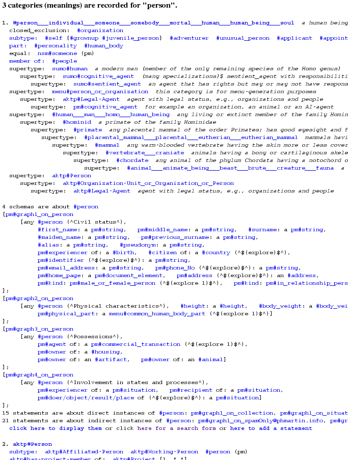 The above line is an FL assertion (i.e., a statement asserted in FL) that relates the formal term pm#thing to the string "something" by a relation of type pm#name. (In FS, both pm#name and pm#thing are predefined. This last term refers to the (non strict) supertype and type of all imaginable types or things). Thus, this line asserts that (and should be read as) "pm#thing has for name 'something'". Hence, given the semantics of pm#name, "something" becomes another name for pm#thing: "thing" and "something" are informal terms/names (which may be names for other things) while pm#thing is a unique identifier (a formal term). Since the main WebKB server (www.webkb.org) accepts conceptual queries as GET parameters, it permits to use different parameters (and hence different URLs) to query different information on the referred object. For example, the next first URL asks for all the direct relations from pm#thing in RDF/XML. The next second URL asks for the direct relations from pm#thing and all its subtypes via a recursive exploration on three levels, in a format similar to FL but relying on indentation.