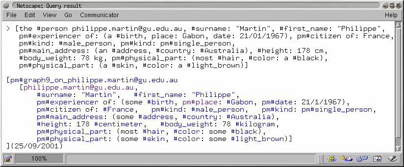 In FS, and in the rest of this document, when referring to terms from an ontology, informal terms (strings) are enclosed within double quotes while formal terms are either not quoted or quoted within a single backquote and the single right quote (as with `pm#thing´). Indeed, such quotes can be used as delimiters for terms and statements in FE. As their prefix indicates, pm#thing and pm#name have been created by `pm´, some user (person or software agent) of FS (and, as it happens, an identifier in the KB of WebKB-2 for the author of this document). In this document, formal things which are not necessarily terms in an ontology (e.g. query operators and syntactic sugar) are single quoted.