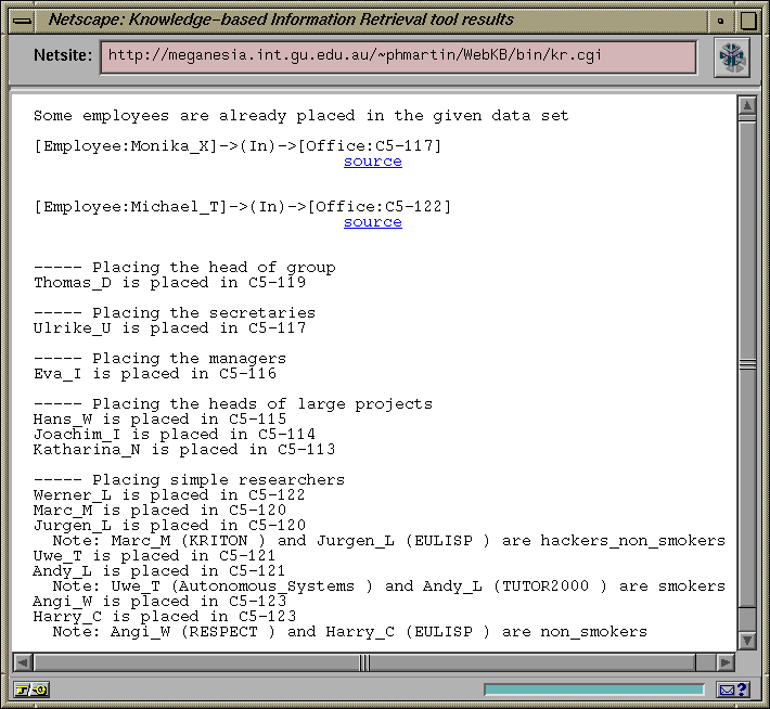 We do not think the application domain of Sisyphus-I is very appropriate for the comparison of knowledge acquisition tools (CG-based or not) since (i) the problem has a natural procedural solution and the ontology is small and fixed (i.e. it is not updated interactively by the users), therefore classic object-oriented language are adequate to solve it, (ii) as opposed to a lot of real-world problems, efficiency is not an issue (it is unlikely that a lot of employees have to be placed and that the problem solver has to be run frequently).