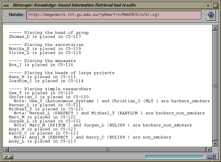 Another solution would be to represent most of properties of individuals using CGs, i.e. using conceptual relations types such as Secretary or Manager to relate a project to its employees, instead of using "instance-of" relations. This solution would need to introduce many relation types in the ontology and therefore many queries on individuals to the script but could be useful if there were more than one research group to handle. In the given protocol, only the research group HQT is considered and this information is not used for allocating offices. Therefore, to simplify the data set and script, and show the exploitation of both CGs and instance relations, we have not chosen that solution.