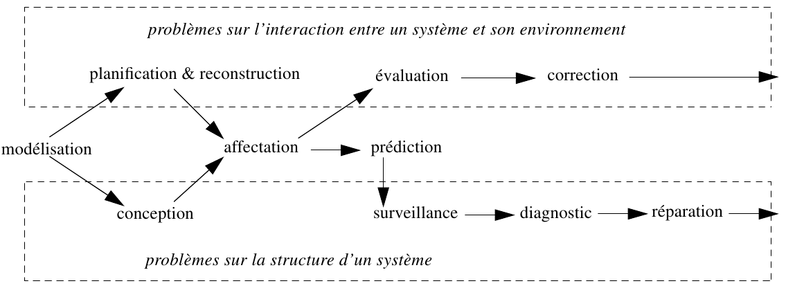 analyse_de_système identification (d'une catégorie) classification classification_simple diagnostic (identification d'une catégorie de faute) diagnostic_faute_unique diagnostic_par_classification_heuristique (modèle du domaine : modèle de faute) diagnostic_systématique (modèle du domaine : modèle de rectitude) localisation_structurelle localisation_causale diagnostic_fautes_multiples évaluation (de correspondance ou d'adéquation : identification d'une classe de décision) surveillance (identification d'une incompatibilité entre une norme et une observation) prédiction (d'un état passé ou futur du système) prédiction_de_comportement prédiction_de_valeurs modification_de_système réparation remède contrôle maintenance synthèse_de_système transformation conception conception_par_transformation conception_par_raffinement conception_par_raffinement_à_flot_unique conception_par_raffinement_à_flots_multiples configuration planification modélisation