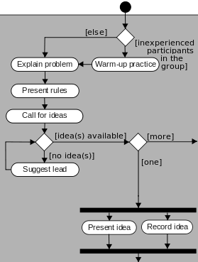 an event *start successor_state: ([ ["inexperienced participants in the group"] = *ip] ] successor_process _[<= [*ip = true] ]: (a "warm-up practice" successor_process: a "explain problem" *ep) successor_process _[<= [*ip = false] ]: (*ep successor_process: (a "present rules" successor_process: a "call for ideas" *cfi //see below ) ) ); *cfi output: [ ["idea(s) available"] = *ideas], successor_process _[<= [*ideas = false] ]: (a test output: [ ["more than 1 idea"] = *moreThan1], successor_process _[<= [*moreThan1 = true] ]: a process *p1, //*p1 is outside of the figure successor_process _[<= [*moreThan1 = false] ]: (a "Present idea" successor_process: a process *p2) successor_process _[<= [*moreThan1 = false] ]: (a "Record idea" successor_process: *p2) ); //the last two processes have the same predecessor // and precondition, and the same successor: *p2 // *p2 is outside of the figure on the left |