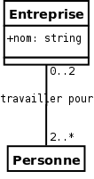 employeur _(personne -> 0..* entreprise), alias: travailler_pour; entreprise attribute: 1 (. nom < string), employeur of : personne __[any->2..*, 0..2<-any], instance: (entrep employeur of : the personne p1 a personne the personne p2 ); |