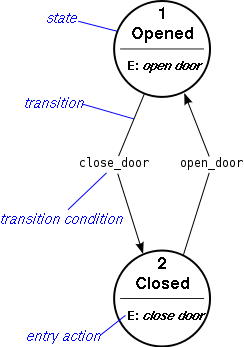 [a state *opened_door] ^ ^ beginning_state| |end_state | | [a door_closing [a door_opening process processs *close_door] *open_door] | ^ end_state| |beginning_state v | [a state *closed_door] //Or, equivalently (the parts in italics are optional): a state *opened_door is beginning_state of: (a door_closing process *close_door that has for end_state: a state *closed_door), is end_state of: (an opening_of_a_door *open_door that has for beginning_state: the state *closed_door); //Or, equivalently: a door_closing process *close_door has for beginning_state: a state *opened_door, has for end_state: (a state *closed_door that is beginning_state of: (an opening_of_a_door *open_door that has for end_state: the state *opened_door) ); |