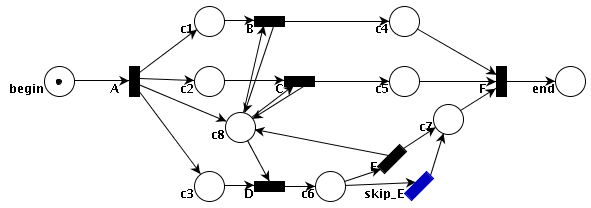 (begin @)→[A *a] { →(c1)→[B *b]→(c4)→[F *f]→(end), //représentation en PNLF →(c2)→[C *c]→(c5)→[*f], →(c3)→[D *d]→(c6) {yes→[E *e]→(c7 *c7), no→[skip_E]→(*c7)→[*f] } }; [*a]→(c8) { →[*d], ←[*e], →[*b], ←[*b], →[*c], ←[*c], →[*f] }. a A *begin //représentation en FL token_activation: 1, //this state is activated with 1 Petri Net token '@' beginning_state of: (a A *a end_state: (a c1 beginning_state of: (a B *b end_state: (a c4 beginning_state of: (a F *f end_state: a end) ))) (a c2 beginning_state of: (a C *c end_state: (a c5 beginning_state of: *f)) ) (a c3 beginning_state of: (a D *d end_state: a c6 *c6) ) ); *c6 beginning_state of _[<= [*someConditionDefinedElsewhere = true] ]: (a E *e end_state: a c7 *c7), beginning_state of _[<= [*someConditionDefinedElsewhere = false] ]: (a skip_E end_state: (*c7 beginning_state of: *f)); *a end_state: (a c8 beginning_state of: *d *b *c *f, end_state of: *e *b *c); |