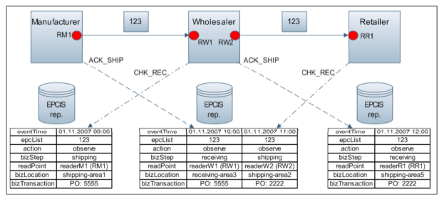 In an EPC-enhanced supply chain, information can be extracted from data gathered querying EPCIS repositories. Such data are called EPCIS events. By extension, we could say that critical information can be extracted starting from those events too. This can be demonstrated considering a three-partner supply chain as shown in Figure 44.
