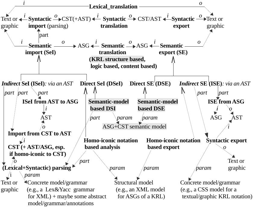 Importing KRs is done by a syntactic parser and a semantic analyser. One input of the parser is a file, e.g., containing a text or a graphic. Another input is a concrete grammar, i.e., a concrete model. The parser outputs a collection of CEs, almost always organized into a Concrete Syntax Tree (CST). It may also output syntax related AEs, typically organized into an Abstract Syntax Tree (AST). From these CEs or AEs, the semantic analyser creates semantically structured AEs, typically organized into an Abstract Semantic Graph (ASG). If these AEs are not the ones required by the importing tool, a translation to other AEs also occurs. The parser may also directly be a semantic analyser, e.g., when the input notations are homo-iconic to the model of the KRL used in the inputs. A KRL is homo-iconic, or a KRL notation is homo-iconic to a KRL model, when its “CST less the CEs that are not syntactic sugar for AEs (e.g., parenthesis)” is isomorphic to the AST or ASG for the model. This happens when the notation forces its user to write structured CEs using the names of their related AEs, as with XML, LISP, N-triples and Prolog. With LISP, all structured AEs can be assimilated to functions. In N-Triples, all structured AEs are binary relations. In Prolog, all structured AEs can be assimilated to relations. Prolog allows the use of “:-” as an abbreviation for an implication relation, and allows the writing of this relation in an infix form – while other relations must be written in a prefix form – but the above definition still holds. On the other hand, RDF/XML, Turtle and JSON-LD are not homo-iconic notations for RDF.