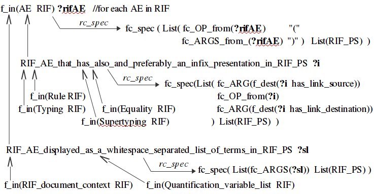 Using RIF-BLD/RIF-PS, a rather intuitive KRL introduced in Table 4.2.1, Table 4.1 first illustrates partial definitions of some functions used in the graph. The other functions used in this graph are similarly defined in KRLO. The second argument of fc_type is a list of notation types since i) an AE may have identical types of CEs in different notations, and ii) fc_type returns a type for CEs that are member of notations of such types. The first argument of fc_type is an ordered list of CE specifications: syntactic sugar (delimiters or separators) or results of functions such as fc_OP_from and fc_ARGS_from. These functions are similar to fc_type but they i) respectively work on the operator and arguments of their AE parameter, and ii) permit to specify the role of each CE in the specified list: operator, argument or separator. Thanks to these roles, the grammar rule to use for parsing such a list of terms can be selected. For exporting into non-indented textual CEs, only the order of the terms in this list is important. The fc_ARGS and fc_ARGS_from functions may have a second argument to enable the specification of a non-space separator to use between the arguments. To conclude, the first rc_spec relation in Table 4.1 specifies that any instance of AE in RIF has (at least, by default) RIF-PS CEs composed of the following sequence of elements, separated by at least one spacing character: 1) the (concrete) representation (in RIF-PS) of the operator of the AE, 2) an opening parenthesis, 3) the representation of its arguments separated by at least one spacing character, and 4) a closing parenthesis. This specifies what we called “the prefix functional form” Simply modifying the order of the elements in this list permits to generate the other presentation forms.
