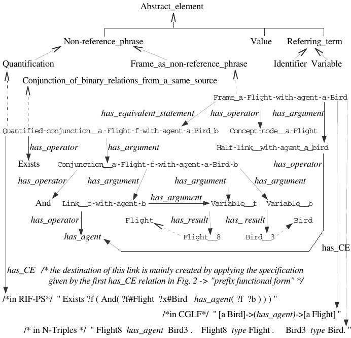Figure 4.1 gives a concrete example for the exploitation of model and notation specifications for KRL import/export/translation purposes. Indeed, Figure 4.1 shows relations between some (types or individuals for) AEs and CEs involved in the representation or export of “A bird flies” in RIF-PS, FL and N-Triples. This statement is represented both via a “frame that is also a connective formula” and a “conjunction of binary relations that is a frame”, two semantically equivalent AEs. In Figure 4.1, all the AEs with names that are not in the courier font come from the AE related part of the top-level of KRLO.