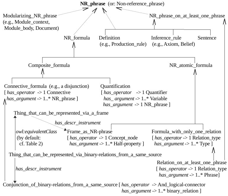 A “link” is an instance of a “binary relation type”. In OWL, such a type is instance of the 2nd-order type “owl:ObjectProperty” or “owl:DatatypeProperty”. As illustrated by these last two identifiers, in the text of this document, as in most W3C notations, “:” is used as separator between the namespace identifier shortcut (here “owl”) and the identifier with the namespace. However, in FL and hence in some examples within tables or figures below, the used separator is “#” because “:” is used for separating a link and its destination node, as in most frame-based notations. However, in the text, the A frame is a statement composed of several links connected to a same source node. A link source/destination node is called a “concept node” and either is a named individual (named term that is not a type) or refers to one or several individuals (e.g., by using a type and a quantifier; in RDF, the quantifier is implicitly the existential quantifier and an unnamed resource node is called a “blank node”). Named terms that are not individuals nor relation types are called “concept types” (“classes” in RDF). In the examples of this article, the default namespace is for the types introduced by KRLO.